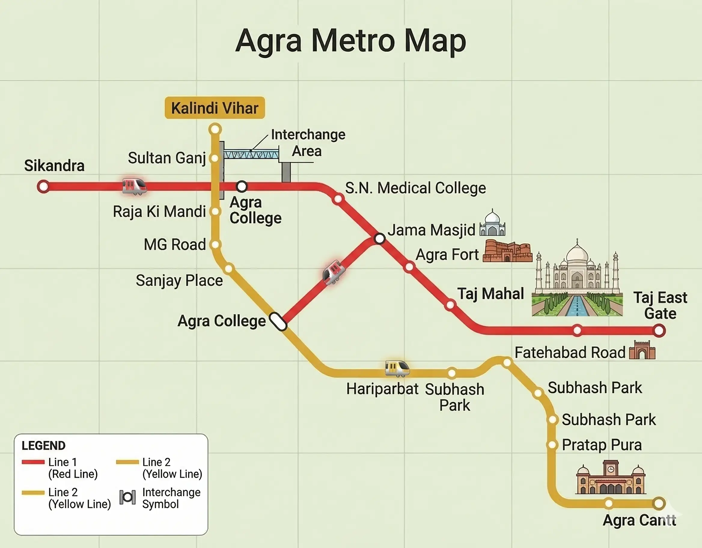 Agra Metro is operated by UPMRC. The priority section of 6 stations was inaugurated on 6 March 2024, making it one of the newest metro systems in India. It connects the iconic Taj Mahal area with the historic Jama Masjid, traversing the heart of the UNESCO World Heritage city.