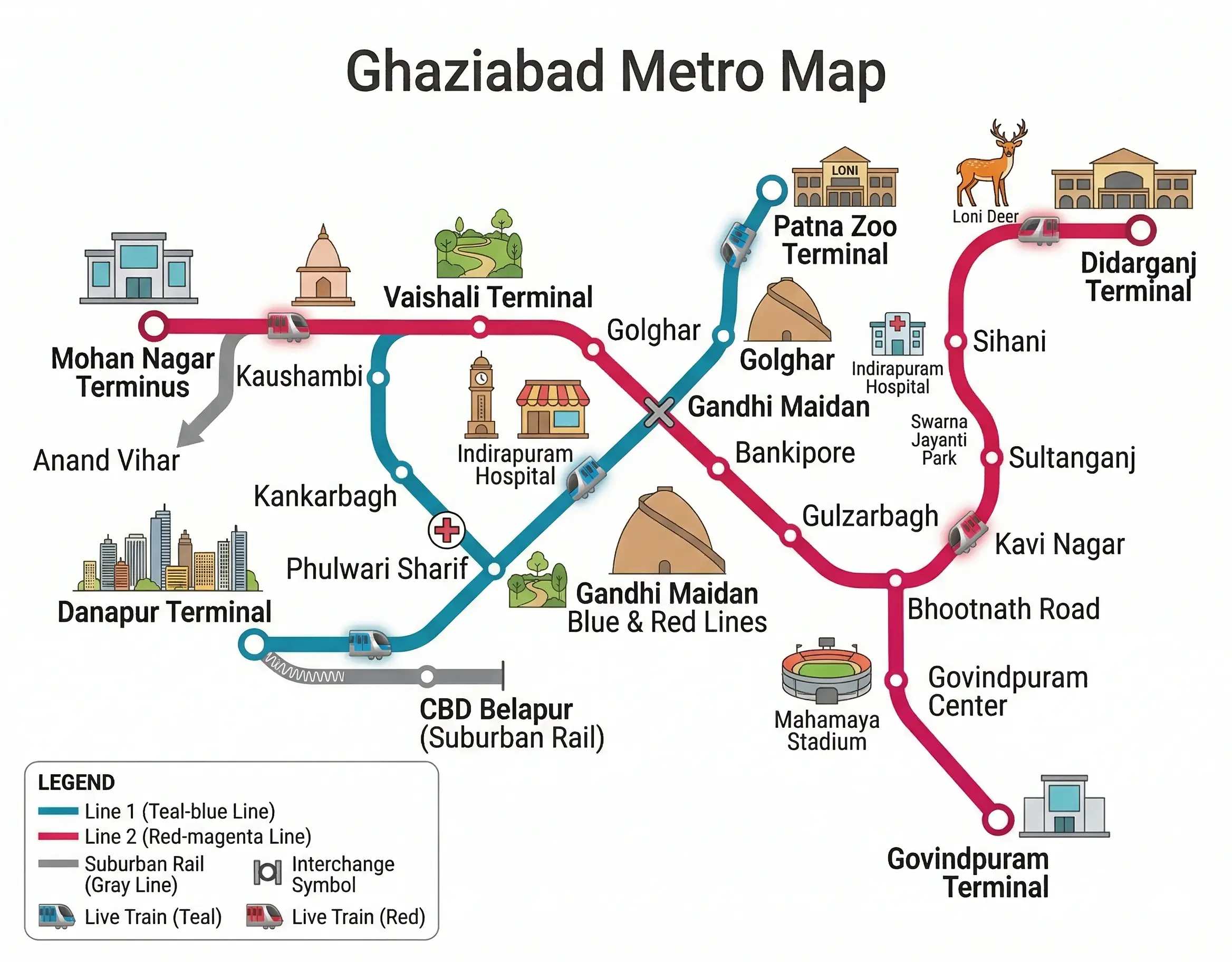 Ghaziabad is served by Delhi Metro via two line extensions — the Red Line (to New Bus Adda) and the Blue Line (to Vaishali). Both extensions were built under Phase 2 of Delhi Metro. Vaishali was inaugurated in 2011 and the Red Line extension opened in 2019, significantly improving the city's connectivity to Delhi.